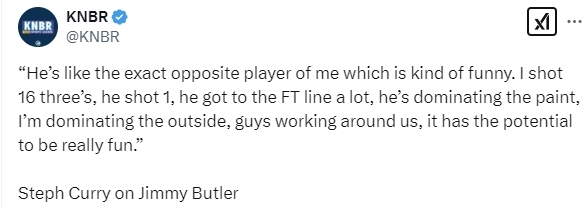 库里在赛后接受媒体采访时谈到了自己的队友巴特勒,他说道:“巴特勒就像是我完全相反的球员,这有点好笑。我投了16个三分球,他投了1个三分球,但他经常能制造罚球。他主宰内线,我主宰外线,我们周围的人也都在努力,这真的很有趣。”