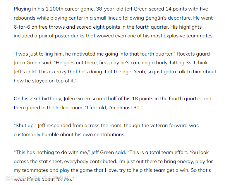 在自己23岁生日这天,杰伦-格林在末节拿到了9分,然后在更衣室内“抱怨”自己老了,已经快30岁了。而杰夫-格林则喊道:“闭嘴。”随后这位老将接受采访,他表示:“这场胜利并非是靠我一个人,而是团队的努力。你看看数据表,每个人都有贡献。我只是带着活力,和我的队友一起打球,打我喜欢的比赛,努力帮助球队取得胜利。这就是对我来说最重要的。”