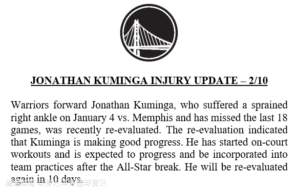 勇士队在公告中写道:“库明加在1月4日对阵孟菲斯灰熊队的比赛中右脚踝扭伤,缺席了过去18场比赛。重新评估结果显示,库明加的恢复正在取得良好进展。他已经开始了场上训练,并有望在全明星赛后取得进步并加入球队训练。他将在10天后再次接受重新评估。”