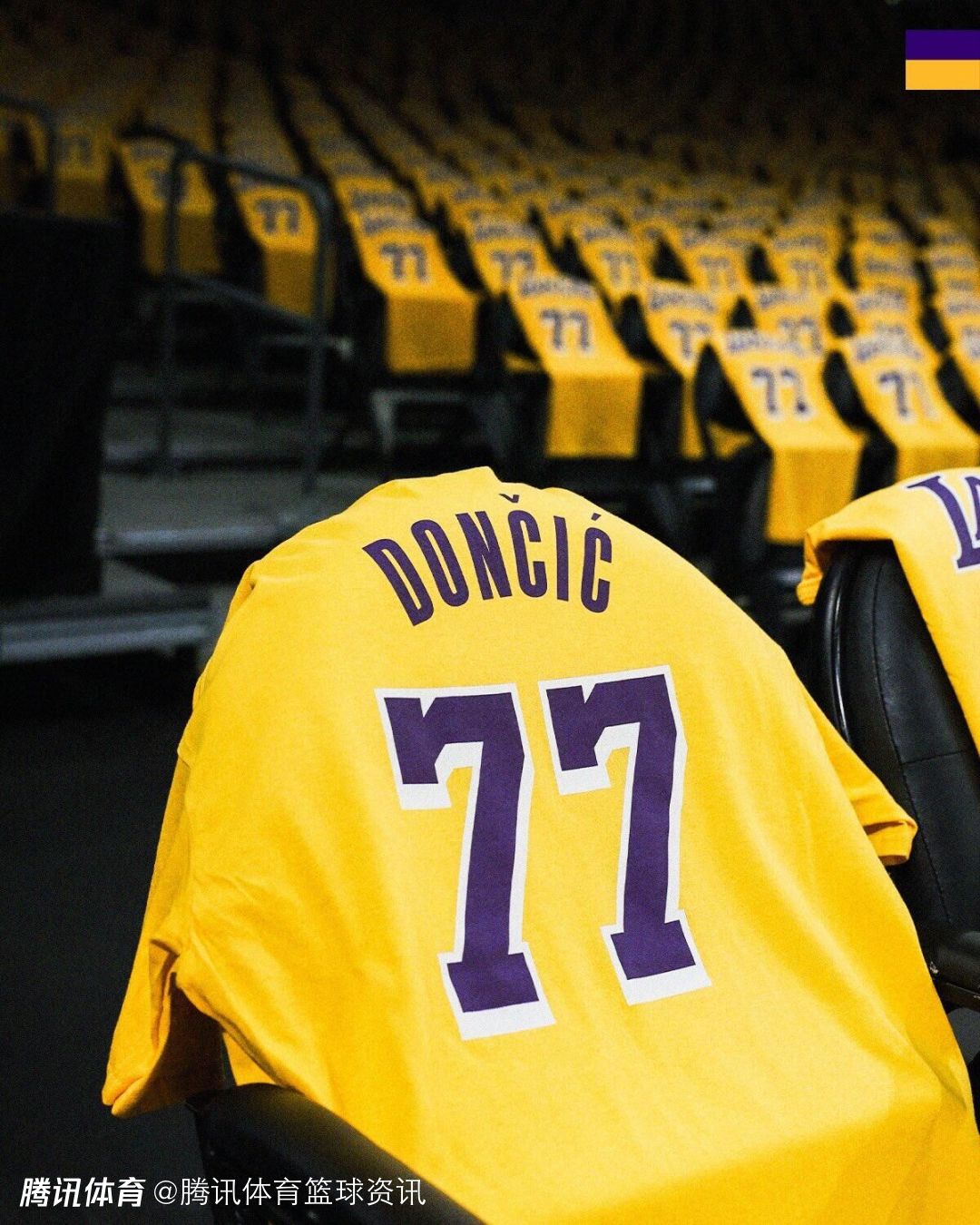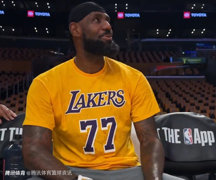 湖人今天将在主场为每一位球迷送出一件东契奇的金色77号T恤,球馆里成为了一片“77号的海洋”。詹姆斯也在赛前热身时穿上了东契奇的77号T恤,表达对这位新队友的支持。