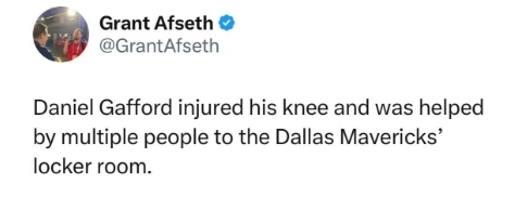 从慢动作回放来看,当时丁威迪试图与加福德进行挡拆配合,但他用一记变向从另一侧进行突破,而国王队的防守球员由于吃了丁威迪的假动作,结果先朝反方向移动,与加福德的膝盖相撞,导致加福德受伤。在发生碰撞后,加福德一度倒地不起,之后被两名工作人员搀扶着,走回了更衣室。在加福德走向球员通道时,现场的独行侠球迷也为他鼓掌进行鼓励。