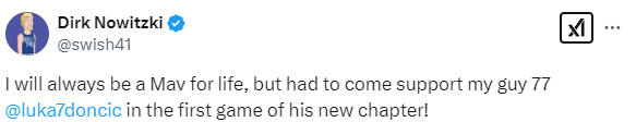 诺天王本人证实并发推:我一生都是独行侠人,但我必须来到现场支持东契奇开启新篇章的第一场比赛。