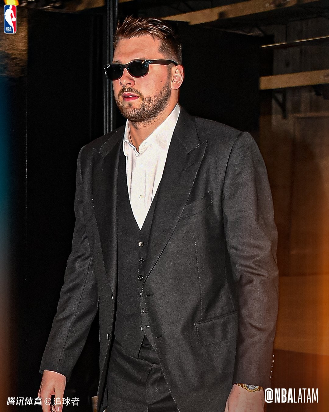 77+23组合将同时登场亮相,湖人队新时代的帷幕正式拉开了;赛前东契奇身穿西装并且戴着墨镜霸气入场,一副大佬的样子。