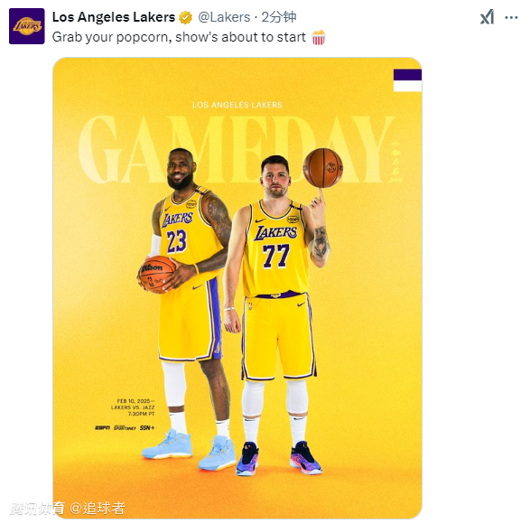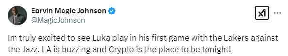 湖人名宿魔术师发推写道:我真是太激动了,看到卢卡即将在对阵爵士比赛中迎来湖人首秀!洛杉矶现在真是热闹非凡,今天Crypto球馆是必去之地!