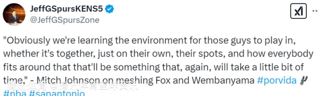 谈及福克斯和文班亚马的搭档,约翰逊表示:“显然,我们正在了解这些球员所处的环境,无论是把他们放在一起,还是让他们分开上场,他们的位置,以及每个人如何在这个环境中去适应,这都需要一些时间。”此役文班亚马拿到31分15篮板4助攻2抢断3盖帽,福克斯拿到30分4篮板6助攻。