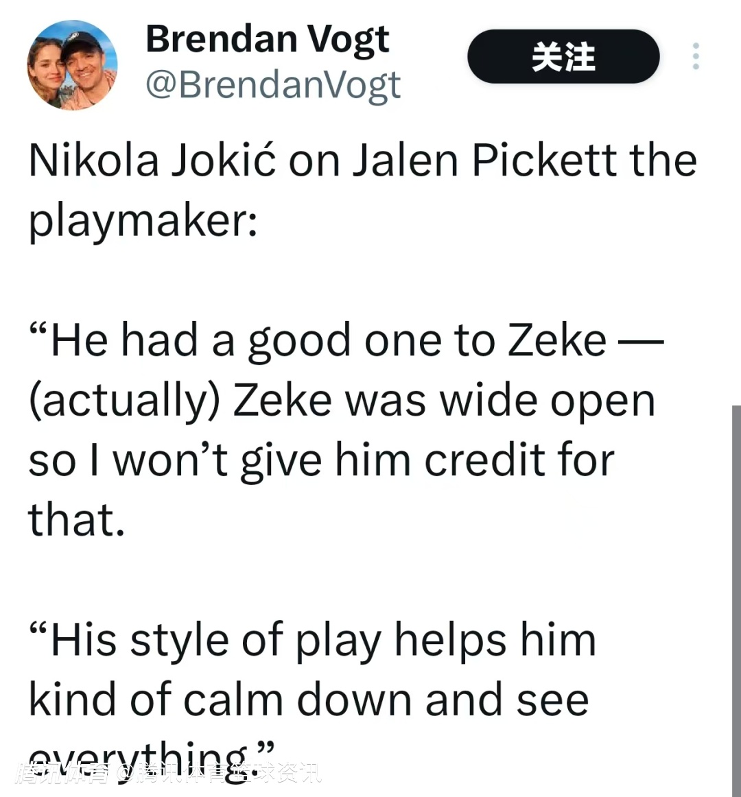在评价队友皮克特的组织能力时,约基奇开玩笑说道:“他给纳吉传了一个好球,其实纳吉当时是完全空位,所以这次助攻的功劳不该算在他头上。他的打球风格让他能够保持冷静,掌控全局。”本场比赛中,皮克特得到14分3篮板9助攻2抢断。