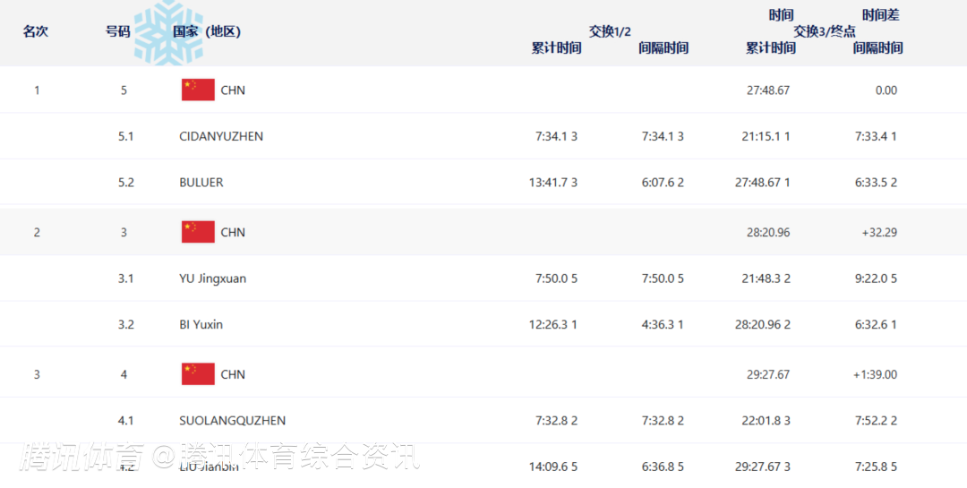 滑雪登山混合接力决赛中,次旦玉珍/布鲁尔成绩为27:48.67,成功拿到金牌,于婧萱/毕禹新则是以28:20.96的成绩拿到银牌,索朗曲珍/刘建宾以29:27.67的成绩拿到铜牌。这样一来,滑雪登山项目正式收官,中国队一共斩获3金3银3铜。
