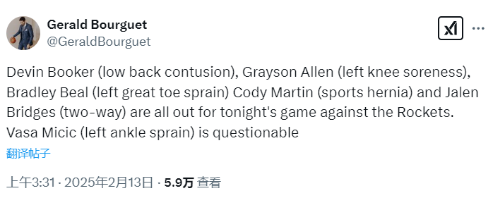 布克(腰部挫伤)、格雷森-艾伦(左膝酸痛)、比尔(左大脚趾扭伤)、科迪-马丁(运动疝气)和布里奇斯(双向合同球员)都将缺席球队对阵火箭的比赛。米西奇(左脚踝扭伤)出战成疑。