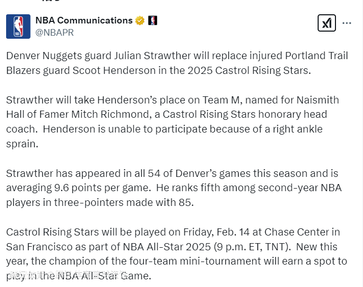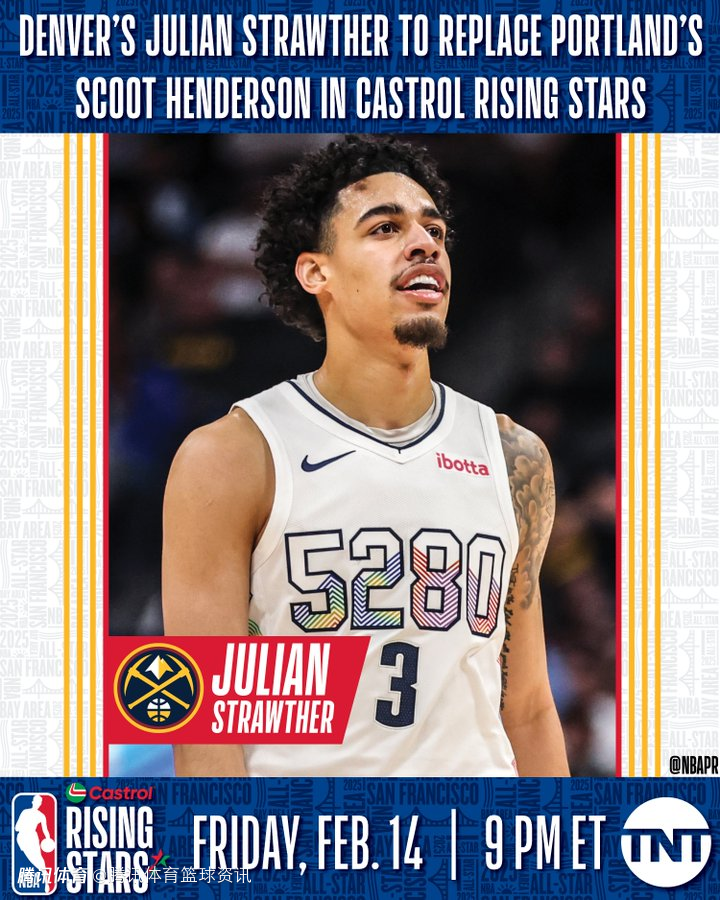 2025-02-13 07:00北京时间2月13日,NBA官方宣布,掘金后卫斯特劳瑟将顶替受伤的波特兰开拓者队后卫斯科特-亨德森参加2025年全明星新秀挑战赛。