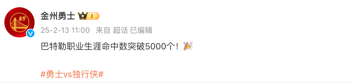 2025-02-13 11:30北京时间2月13日,NBA常规赛,勇士客场挑战独行侠,本场比赛吉米-巴特勒迎来生涯里程碑,职业生涯命中数突破5000个。