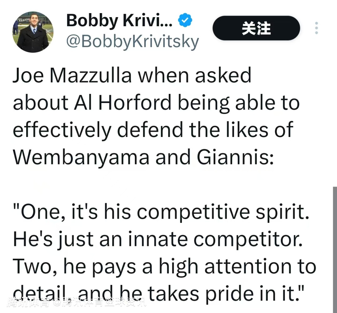 当被问及霍福德如何有效防守像文班亚马和字母哥这样的顶级球员时,马祖拉表示:“首先,是他的竞争精神。他天生就是一名竞争者,永远渴望胜利。其次,他非常注重细节,并且为此感到自豪。这种对细节的关注让他能够在防守时更好地应对对手的每一个动作。”