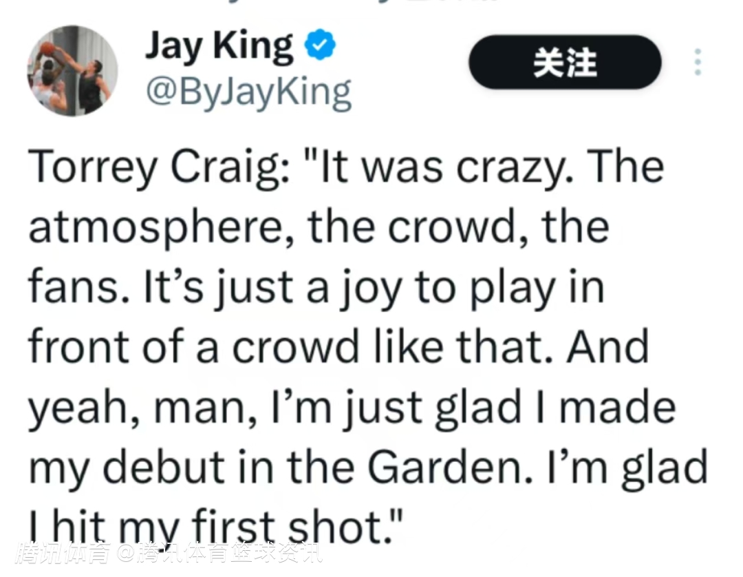 克雷格说道:“那太疯狂了。那种氛围,观众,球迷。能在那样的观众面前打球真是太开心了。是啊,我很高兴能在花园球馆完成我的首秀,也很高兴我投进了第一个球。”