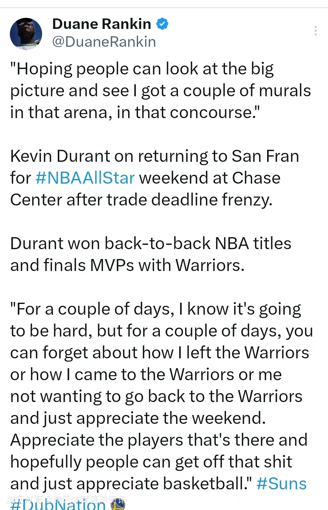 谈在交易截止日的喧嚣后,回到旧金山大通中心参加NBA全明星周末一事,杜兰特表示:“希望大家能从大局着眼,看看我在那座球馆的走廊里有几幅壁画。”杜兰特曾随勇士队连续两次夺得NBA总冠军,并两次荣膺总决赛最有价值球员。