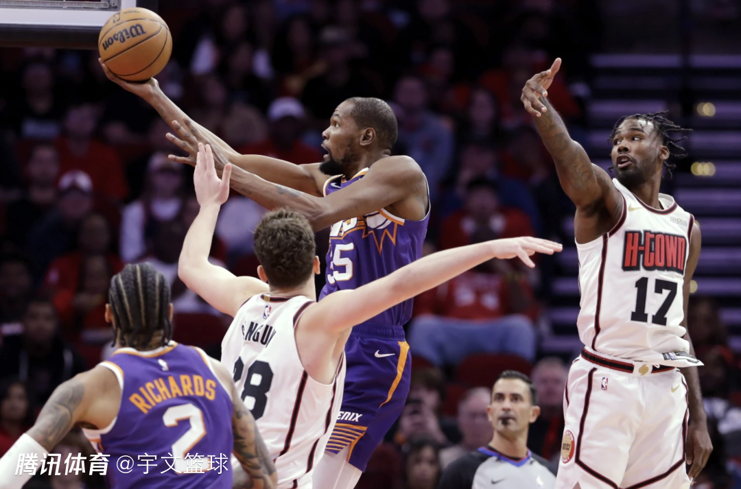 布克缺阵,杜兰特背靠背贡献30+独木难支,火箭险胜太阳超越湖人重返西部前四。