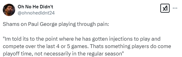 对于乔治带伤忍痛坚持比赛,名记shams报道称,消息人士透露,乔治已经注射了药物,可以参加过去 的4-5场比赛,这是球员在季后赛时会做的事情,不一定是在常规赛中。