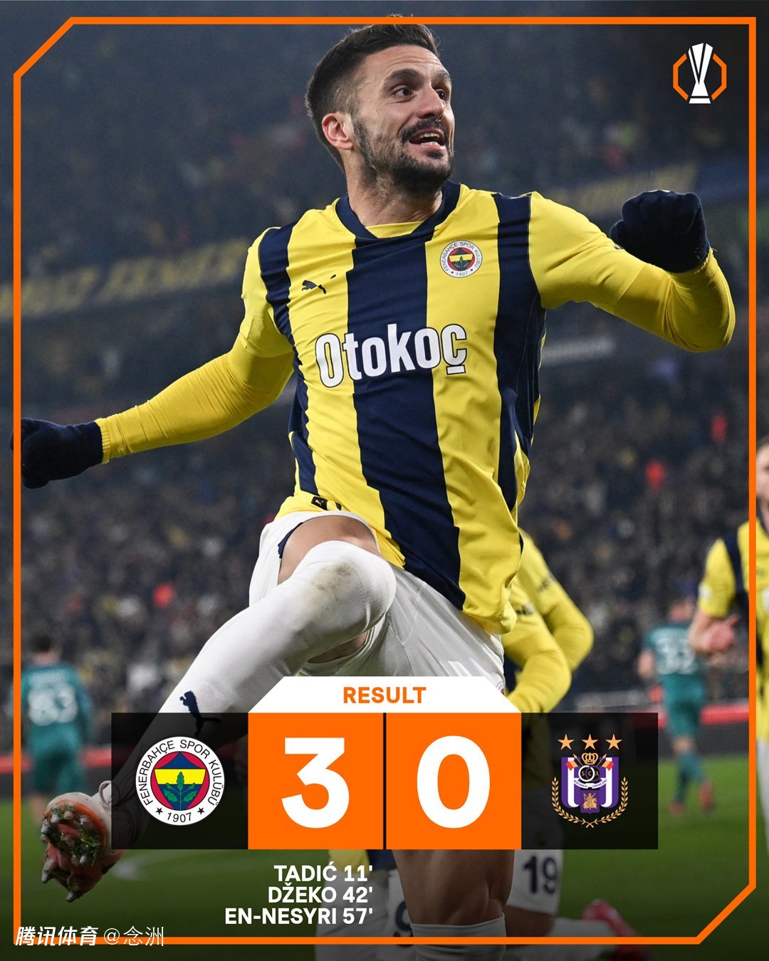 穆里尼奥执教的费内巴切主场3-0大胜安德莱赫特,塔迪奇头球破门首开纪录,哲科破门扩大领先,恩内斯里远距离头球破门。