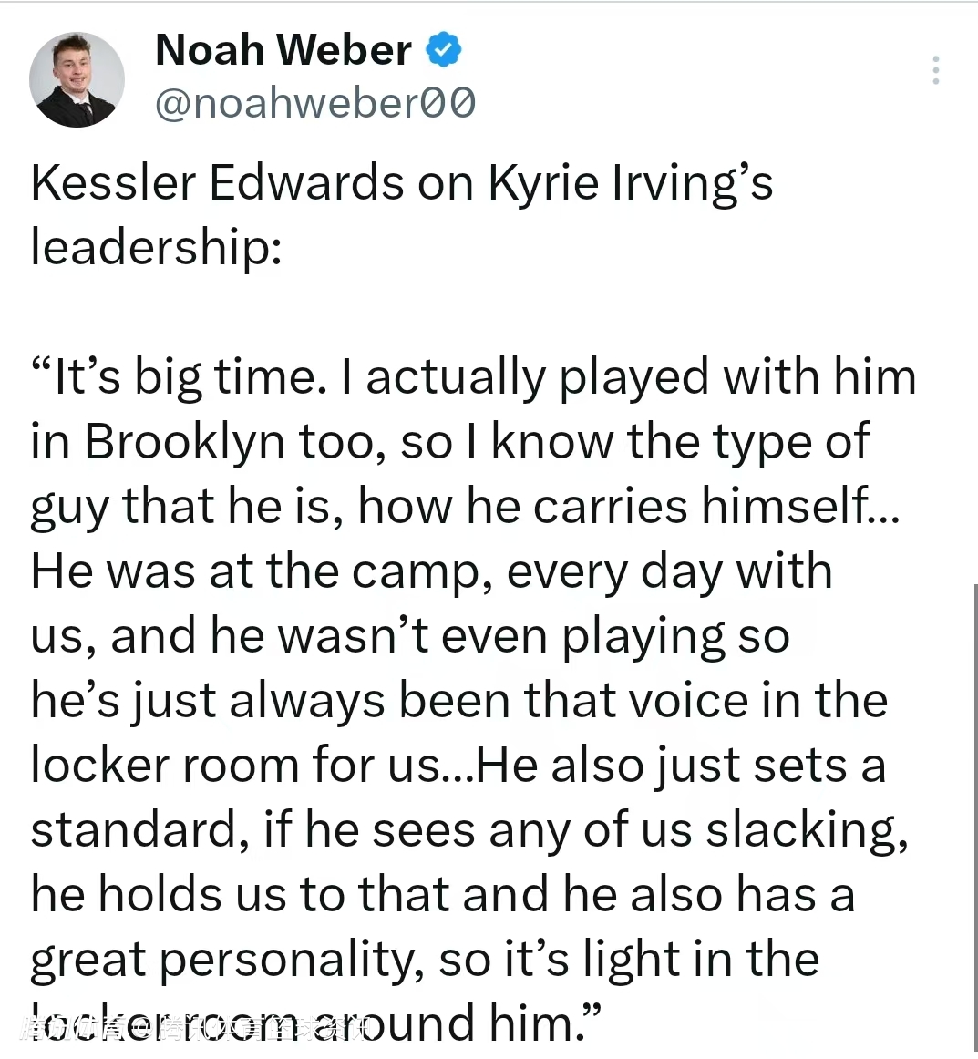 谈到欧文的领导力,爱德华兹表示:“这影响巨大。实际上我在布鲁克林也和他一起打过球,所以我了解他是怎样一个人,知道他如何为人处世。他来到训练营,每天都和我们在一起,即便他不参赛,他也一直是我们更衣室里的主心骨。他还树立了标准,要是看到我们谁偷懒,他就会督促我们,而且他人格魅力十足,有他在,更衣室里气氛轻松愉快。”