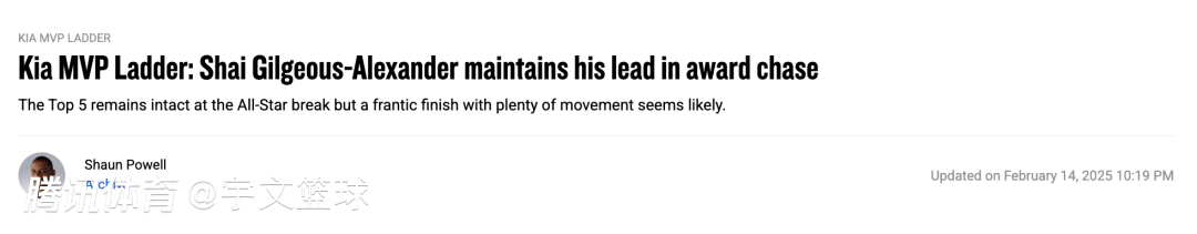 NBA官方MVP榜:亚历山大六连榜首 詹姆斯强势第6杜兰特获提名