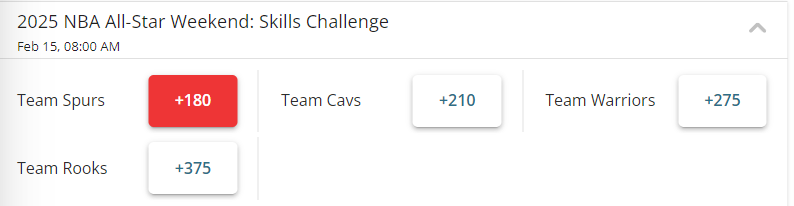 技巧挑战赛最被看好夺冠的是马刺队(+180),保罗和文班亚马的组合非常被看好。随后是骑士队(米切尔+莫布利)、勇士队(格林+穆迪),最不被看好的是新秀队(里萨谢+萨尔)。