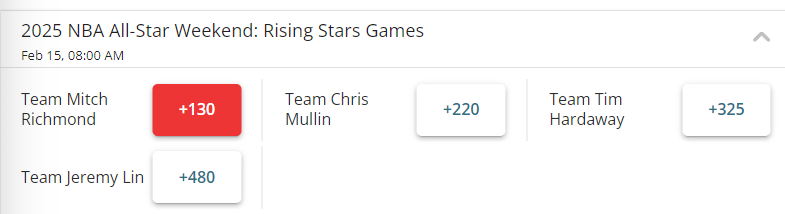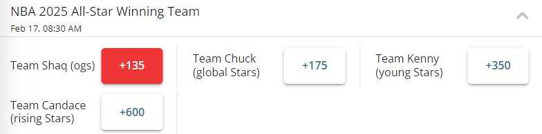 全明星正赛的头号夺冠热门,是奥尼尔选出的NBA元老队(+135),随后是巴克利的全球明星队,史密斯的年轻球星队,最不被看好的是新秀赛胜出的球队。