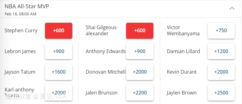 今年的全明星正赛将采用迷你锦标赛的模式,MVP的归属也有了更大的不确定性。赔率显示,目前最被看好的是库里和亚历山大,两人同为+600,排在第三的是首次入选全明星的文班亚马,他在近日采访中表示自己会认真去打全明星赛。詹姆斯和爱德华兹并列第四,利拉德排名第六,随后是塔图姆、米切尔、杜兰特、唐斯、布伦森和杰伦-布朗等人。