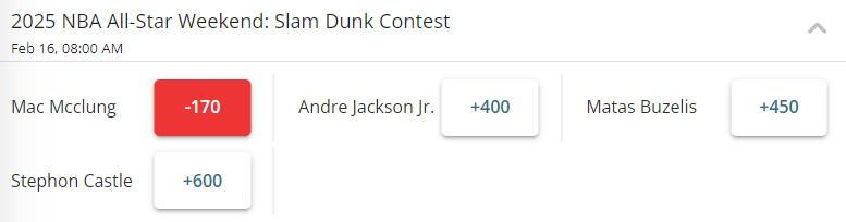 扣篮大赛冠军的头号热门是已经实现两连冠的麦克朗(-170)。这位G联赛球员的扣篮能力,已经无需赘言,他最被看好的另一个原因,在于联盟为他找来的三位对手,无论扣篮实力还是名气上都很一般。雄鹿小将杰克逊目前夺冠赔率排名第二,公牛的布泽利斯第三,马刺的卡斯尔垫底。
