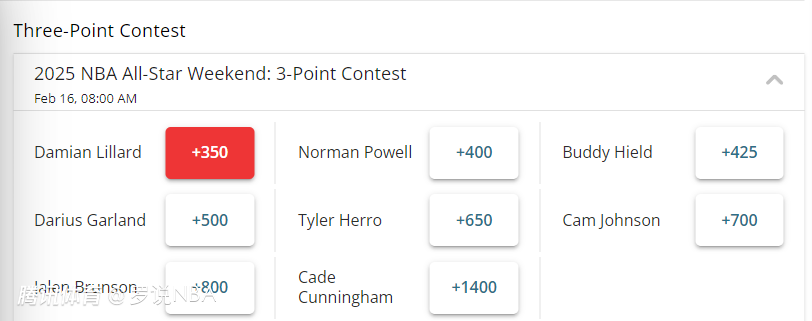 三分大赛冠军的头号热门是雄鹿球星利拉德(+350)。他已经连续两年夺得该项赛事的冠军,如果利拉德再次夺冠,他将比肩伯德和霍奇斯两位前辈,他俩都曾连续三年获得三分大赛的冠军。按照赔率排名,利拉德身后依次是鲍威尔、希尔德、加兰、希罗、约翰逊、布伦森和坎宁安。