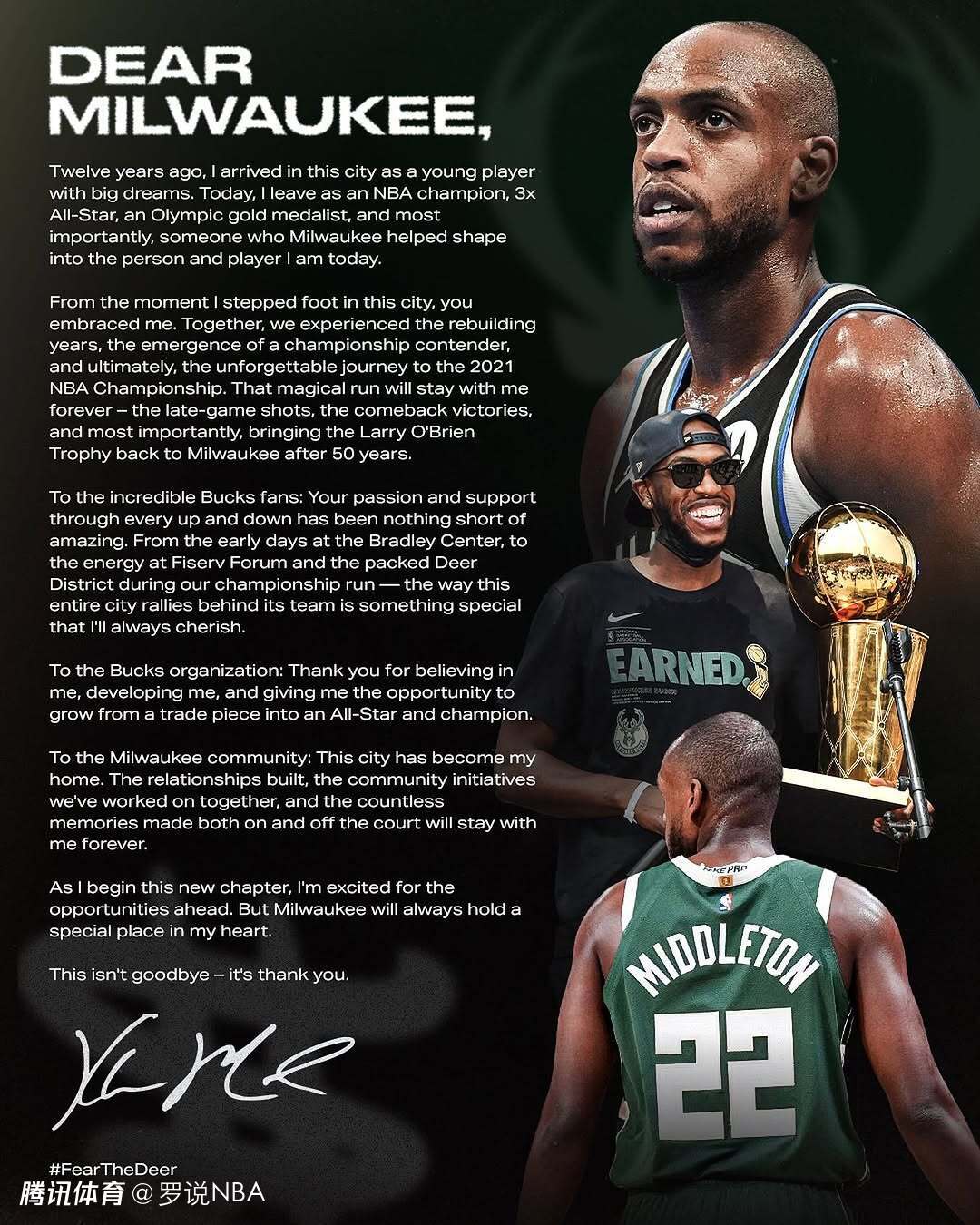 从我踏上这座城市的那一刻起,你们就拥抱了我。我们一起经历了重建的岁月、成为冠军争夺者以及最终令人难忘的2021年NBA总冠军之旅。那神奇的旅程将永远伴随着我——最后的投篮、逆转胜利,以及时隔50年将奥布莱恩奖杯带回密尔沃基。