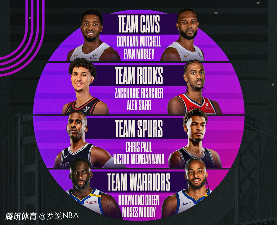 和上赛季相比,今年的技巧挑战赛的赛制有所变化,一共分为四队,每队是两人,而不是此前的三人。参赛的四支球队分别是东道主勇士队(格林+穆迪)、马刺队(保罗+文班亚马)、骑士队(米切尔+莫布利)和新秀队(里萨谢+萨尔)。