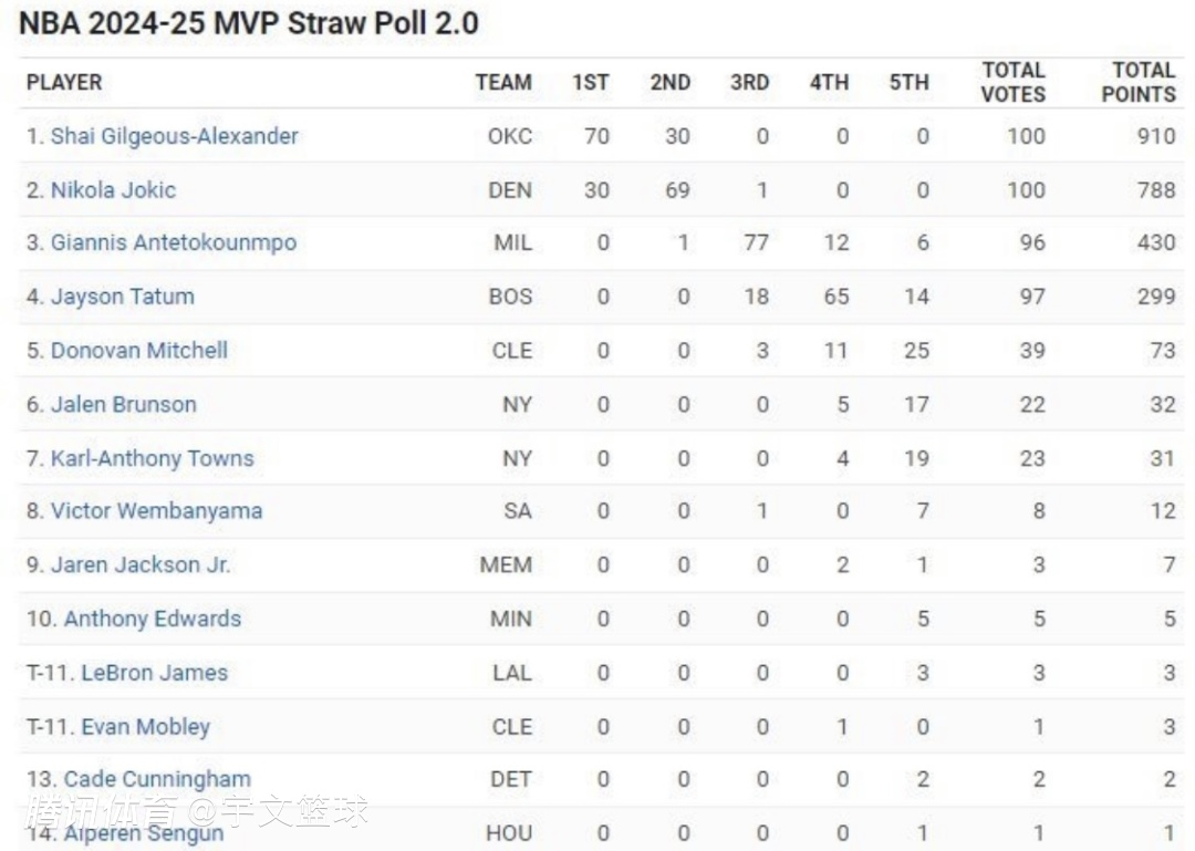 亚历山大910分、约基奇788分、字母哥430分、塔图姆299分、米切尔73分、布伦森32分、唐斯31分、文班亚马12分、小贾伦-杰克逊7分、爱德华兹5分、詹姆斯3分、莫布利3分、坎宁安2分、申京1分