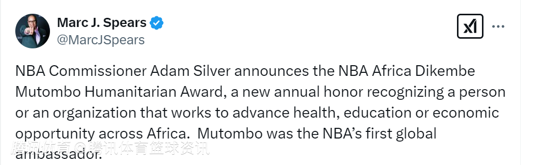 据悉,这一新的年度荣誉旨在表彰那些致力于在非洲推进健康、教育或经济机会方面作出重要贡献的个人或组织。该奖项将以穆托姆博的名字命名,他也是NBA的首位全球大使。