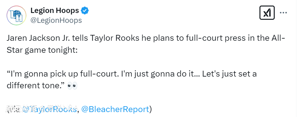 此前,首次入选全明星的文班亚马表示自己会在正赛上全力以赴,如今,小贾伦-杰克逊加入了他的行列。杰克逊说道:“我之前就跟他们说过,我说,‘我要全场紧逼防守。’我就是要这么做,因为,你知道的,咱们得定下不一样的基调。这是一种不同的比赛形式。显然,你可不想在一场比赛中被对手狂虐到40分(指分差很大)。”