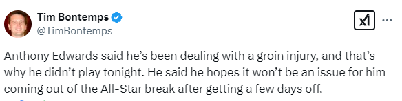 据名记Tim Bontemps报道,爱德华兹表示他一直在处理腹股沟伤势,这就是他今晚没有上场的原因。他说,希望在全明星赛休息几天后,这不会成为他复出的大问题。