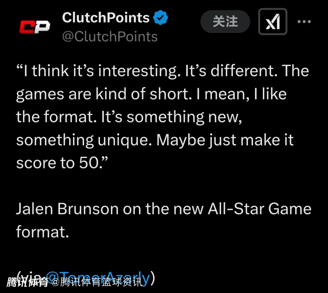 布伦森:我喜欢全明星新赛制 目标分数提高到50分更有趣