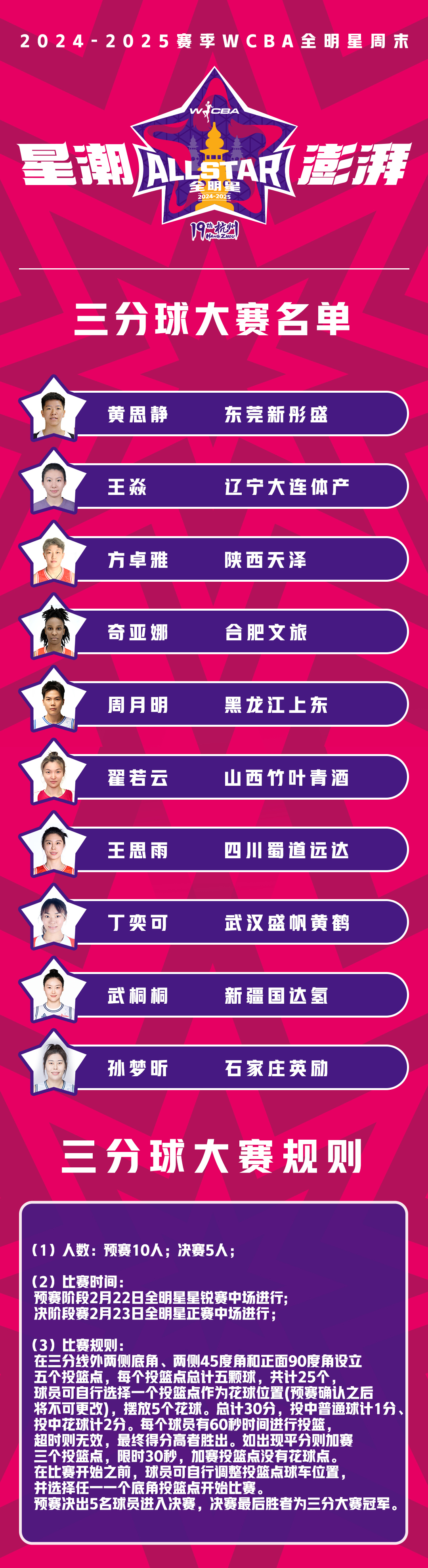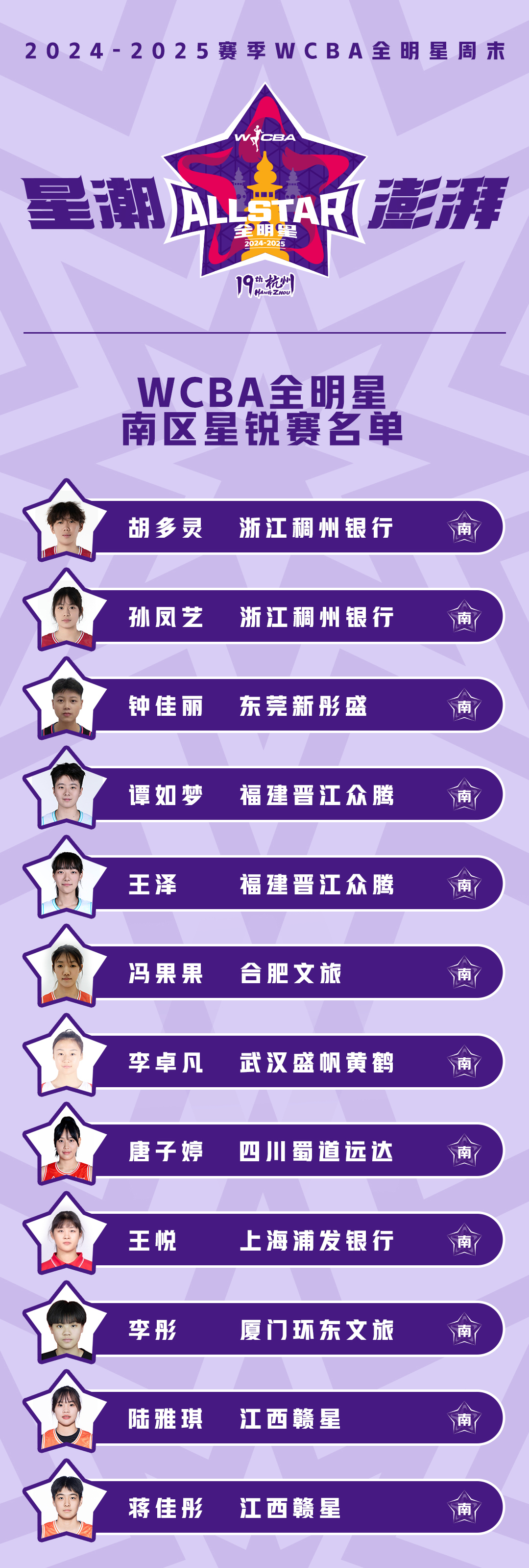 发布会官方宣布,2024-2025赛季WCBA全明星周末即将于2025年2月22日至23日在浙江杭州黄龙体育中心拉开帷幕。在全明星首发阵容的票选中,南区球员王思雨凭借超高人气当选票王,北区则由翟若云成功当选。李梦、韩旭、杨舒予等明星球员也成功入选首发阵容,她们将在全明星正赛中为球迷们奉献一场精彩绝伦的比赛。