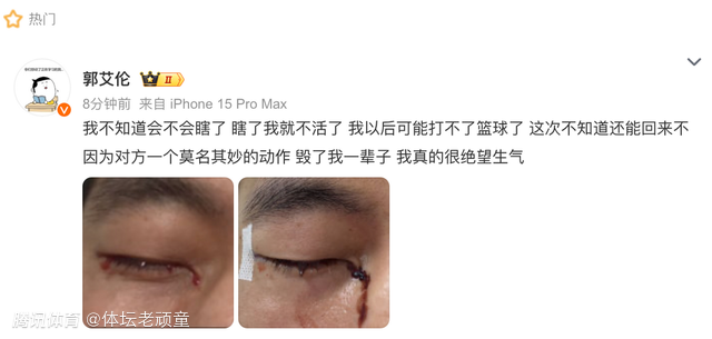 郭艾伦具体是说:“我不知道会不会瞎了,瞎了我就不活了,我以后可能打不了篮球了,这次不知道还能回来不,因为对方一个莫名其妙的动作毁了我一辈子,我真的很绝望生气!”