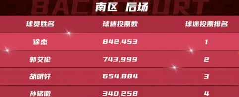 根据CBA官方公示,郭艾伦以74万票排在南区后场球员第二,仅次于票王徐杰。若是郭艾伦缺席的情况下,65万票的胡明轩会替补吗?