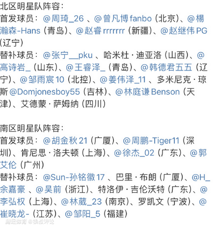 CBA官方公布的南区全明星阵容,胡明轩并没有进入到替补阵容,而是孙铭徽,吴前,林葳,崔晓龙,布朗。