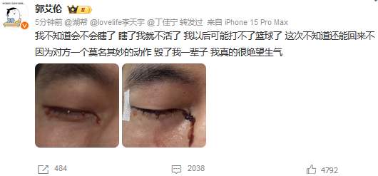 郭艾伦社媒说道:我不知道会不会瞎了 瞎了我就不活了 我以后可能打不了篮球了 这次不知道还能回来不 因为对方一个莫名其妙的动作,毁了我一辈子,我真的很绝望生气 。