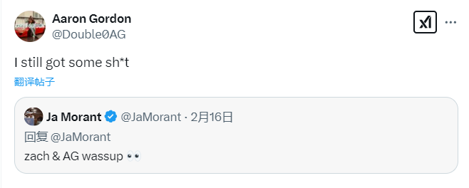 2025-02-19 06:00北京时间2月19日,掘金前锋阿隆-戈登回复了莫兰特的社媒,写道:“我还有点东西。”此前莫兰特有兴趣参加扣篮大赛,还喊话拉文和戈登一起参加。拉文已经回应:“我在想着我也许会再来一次……”,如今戈登也暗示要回归扣篮大赛了。