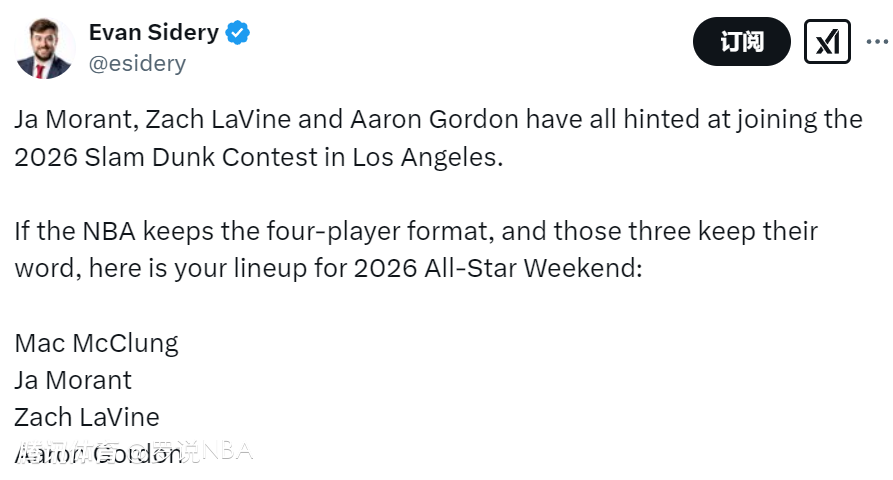 名记Sidery表示:“莫兰特、拉文和戈登都暗示将参加2026年洛杉矶扣篮大赛。如果NBA保持四人赛制,并且这三人信守承诺,那么2026年全明星周末扣篮大赛的阵容预计如下:麦克朗、莫兰特、拉文、戈登。”