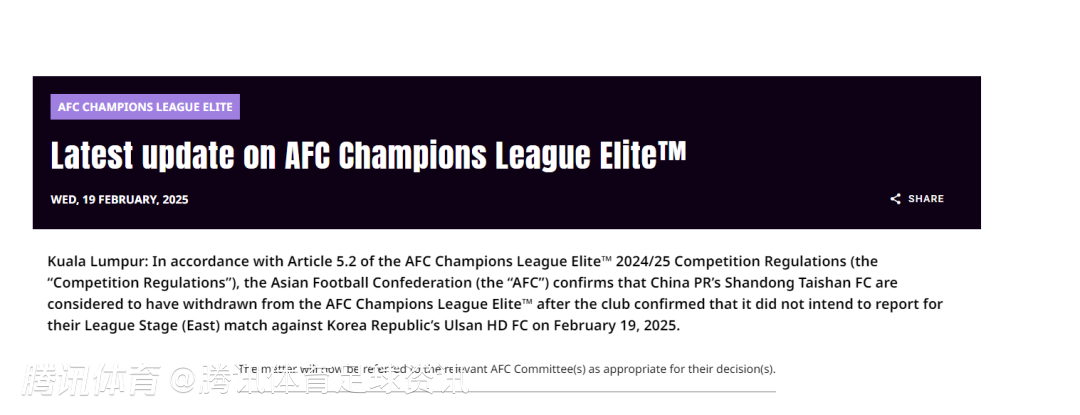 根据《亚足联冠军联赛精英赛2024/25竞赛规程》第5.2条款规定,亚足联确认中国山东泰山足球俱乐部因明确表示不参加原定于2025年2月19日与韩国蔚山HD足球俱乐部进行的东亚区联赛阶段赛事,现被视为退出本届亚足联冠军联赛精英赛。该事件将依照程序提交至亚足联相关委员会进行后续裁决。