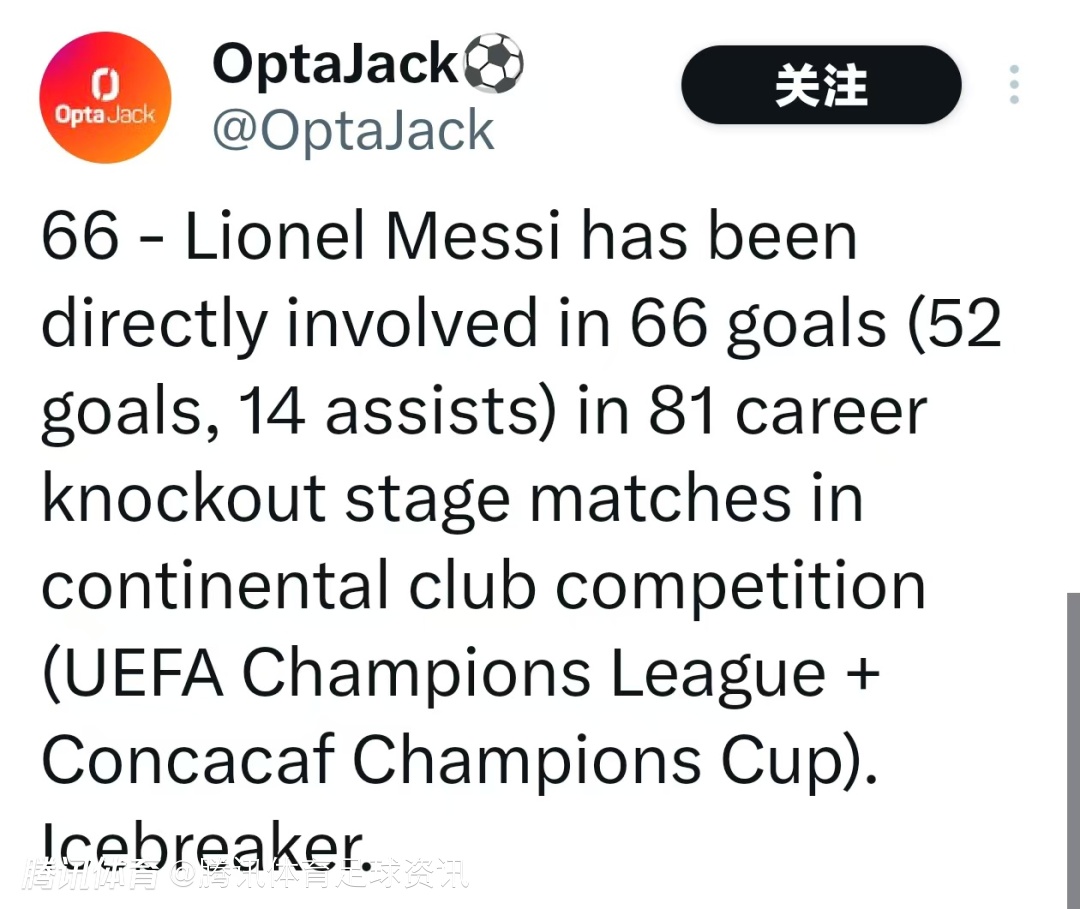 根据数据统计显示,梅西在其参加的81场洲际级别俱乐部淘汰赛(欧冠及中北美和加勒比地区冠军杯)阶段比赛中已参与66粒进球,打进52球并贡献14次助攻。