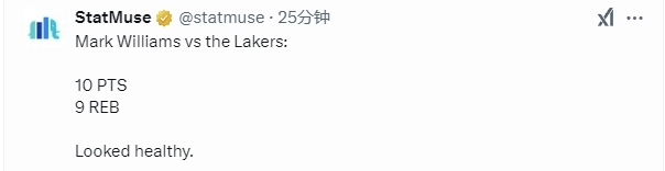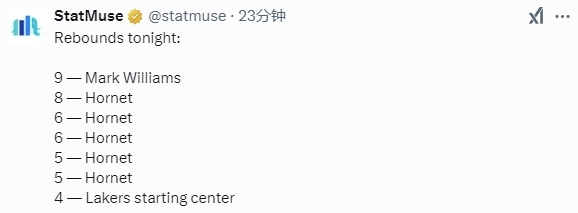 2025-02-20 14:10北京时间2月20日,NBA常规赛继续进行,黄蜂队100-97击败湖人队。黄蜂队中锋马克-威廉姆斯(下文简称马威)此役出战29分钟,7投3中得到10分9篮板2助攻。赛后,数据媒体StatMuse晒出了马威与湖人队中锋的对比数据。