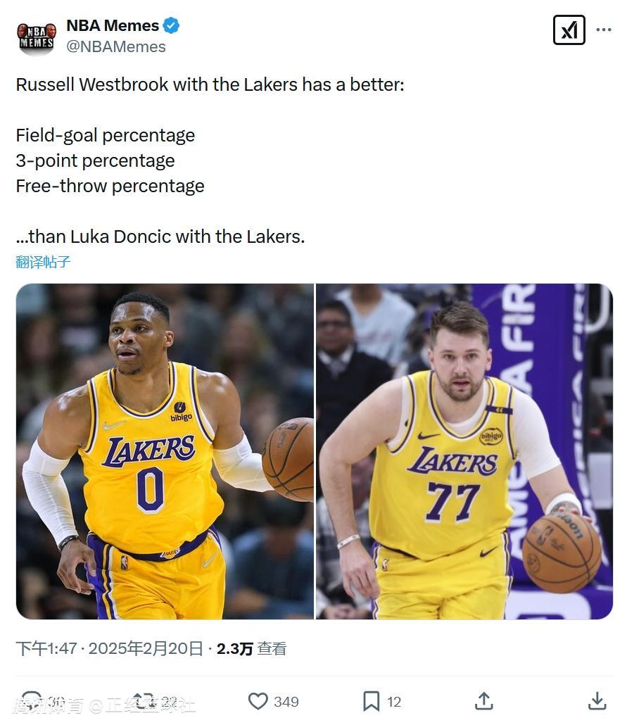 作为对比,威少在湖人队效力两个赛季,期间共出战130场比赛,威少首发出战81场,替补出战49场,期间湖人队56胜74负,胜率为43.1%。威少湖人队期间场均可以得到17.7分6.9篮板7.2助攻,三项命中率43/30/66%。也正因此,有美媒将他俩放在一起进行对比。