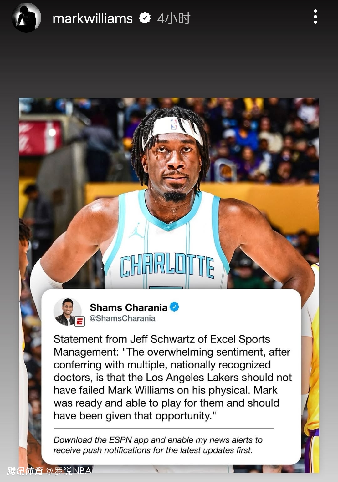 “在与多位全美知名的医生协商后,压倒性的意见是,洛杉矶湖人队不应该判定马克-威廉姆斯体检不合格。马克-威廉姆斯本已经准备好并且能够为他们效力,他本应该得到这个机会。”施瓦茨在声明中写道。