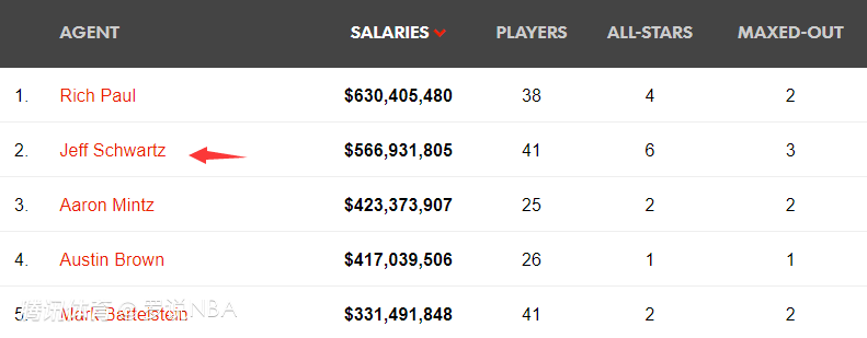 施瓦茨是业内非常知名的经纪人,在里奇-保罗崛起前,他常年霸占NBA经纪人的头把交椅。目前在HoopsHype的经纪人排行榜上,施瓦茨名列第二,他旗下签有41名NBA球员,本赛季总薪水是5.669亿美元,约基奇、贾马尔-穆雷、麦科勒姆、米德尔顿、波尔津吉斯、希罗等人都是他的客户。