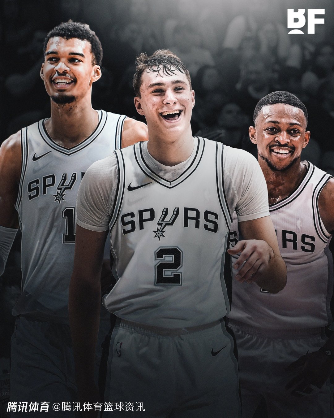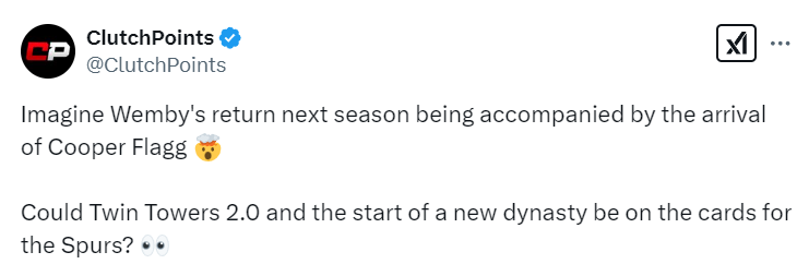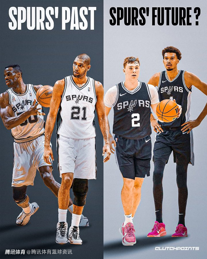 随后,美国媒体ClutchPoints发布了一张球队名宿大卫-罗宾逊和蒂姆-邓肯,以及文班亚马和明年状元大热门弗拉格的合成照片,并配文称:“想象一下,文班亚马在新赛季回归的同时,库珀-弗拉格也加入球队。马刺队是否有机会迎来双塔2.0时代,并开启一段新的王朝?”