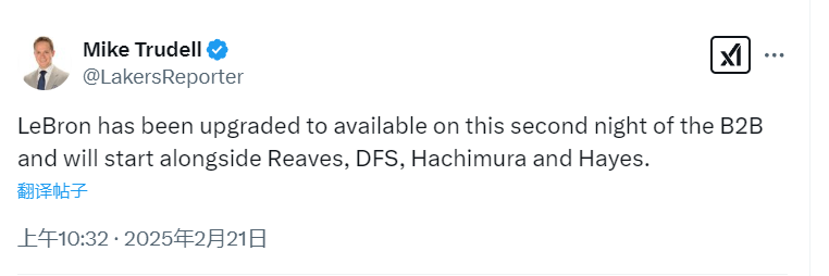 2025-02-21 10:50北京时间2月21日,根据湖人方面发布的最新消息显示,詹姆斯在背靠背比赛的第二晚状态升级为可以出战,并将与里夫斯、芬尼-史密斯、八村垒和海耶斯一起首发出战开拓者。