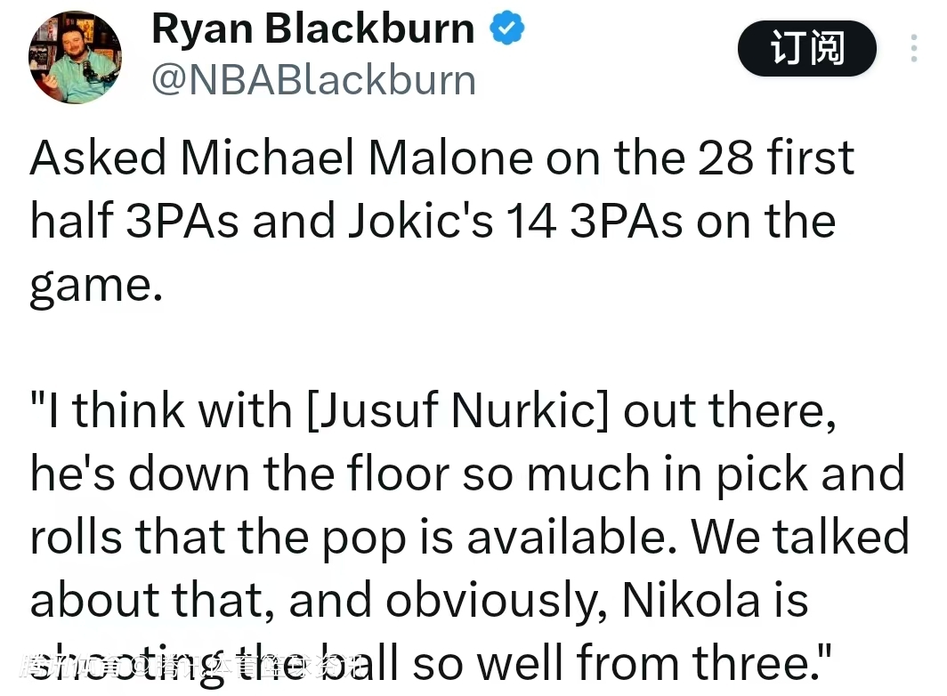 谈到上半场球队三分球出手28次,而且约基奇本场三分球出手14次,马龙表示:“我觉得对方的努尔基奇在场时,他在挡拆后经常下沉到低位,这样外线就有了空位出手三分的机会。我们赛前讨论过这点,显然,约基奇的三分手感也非常好。”